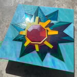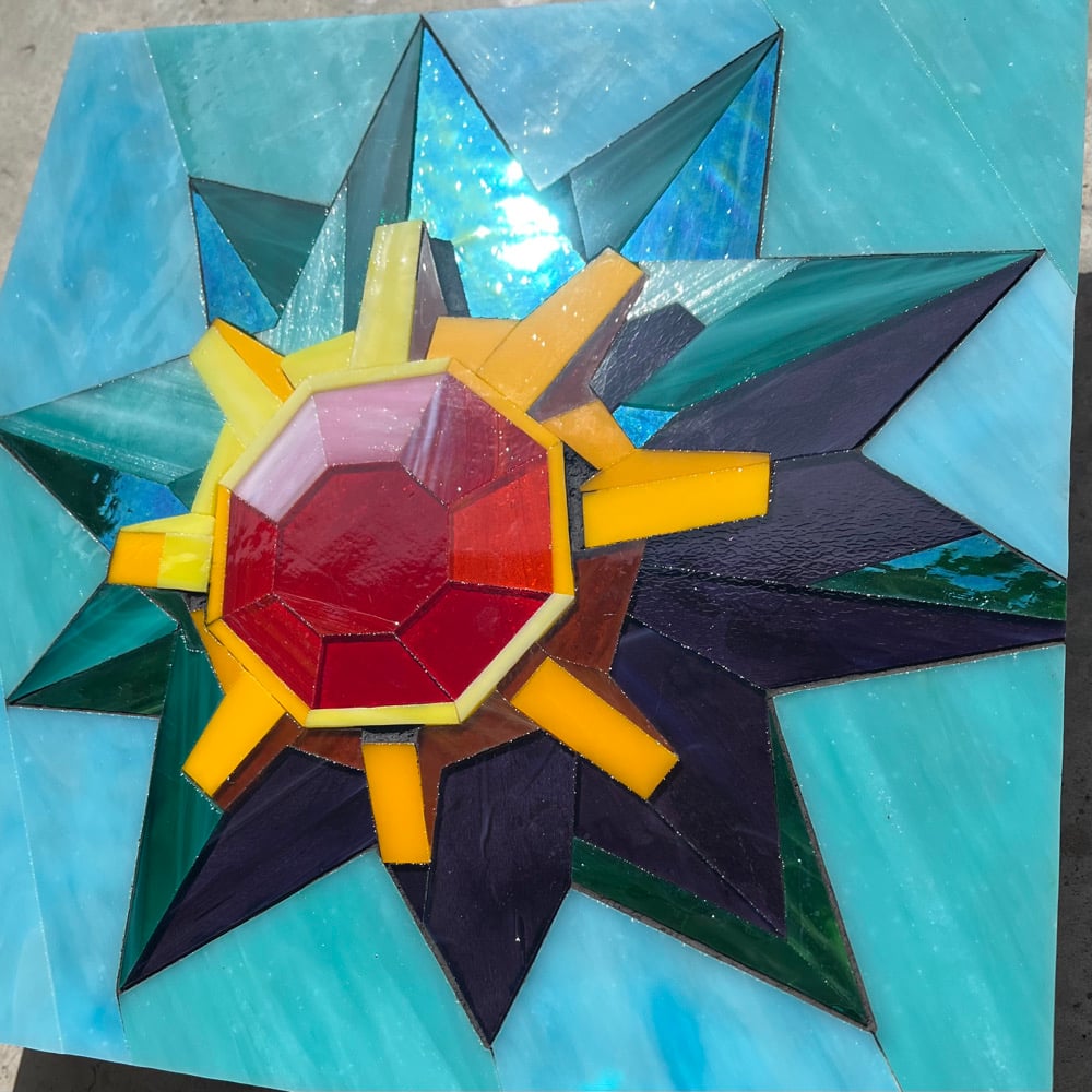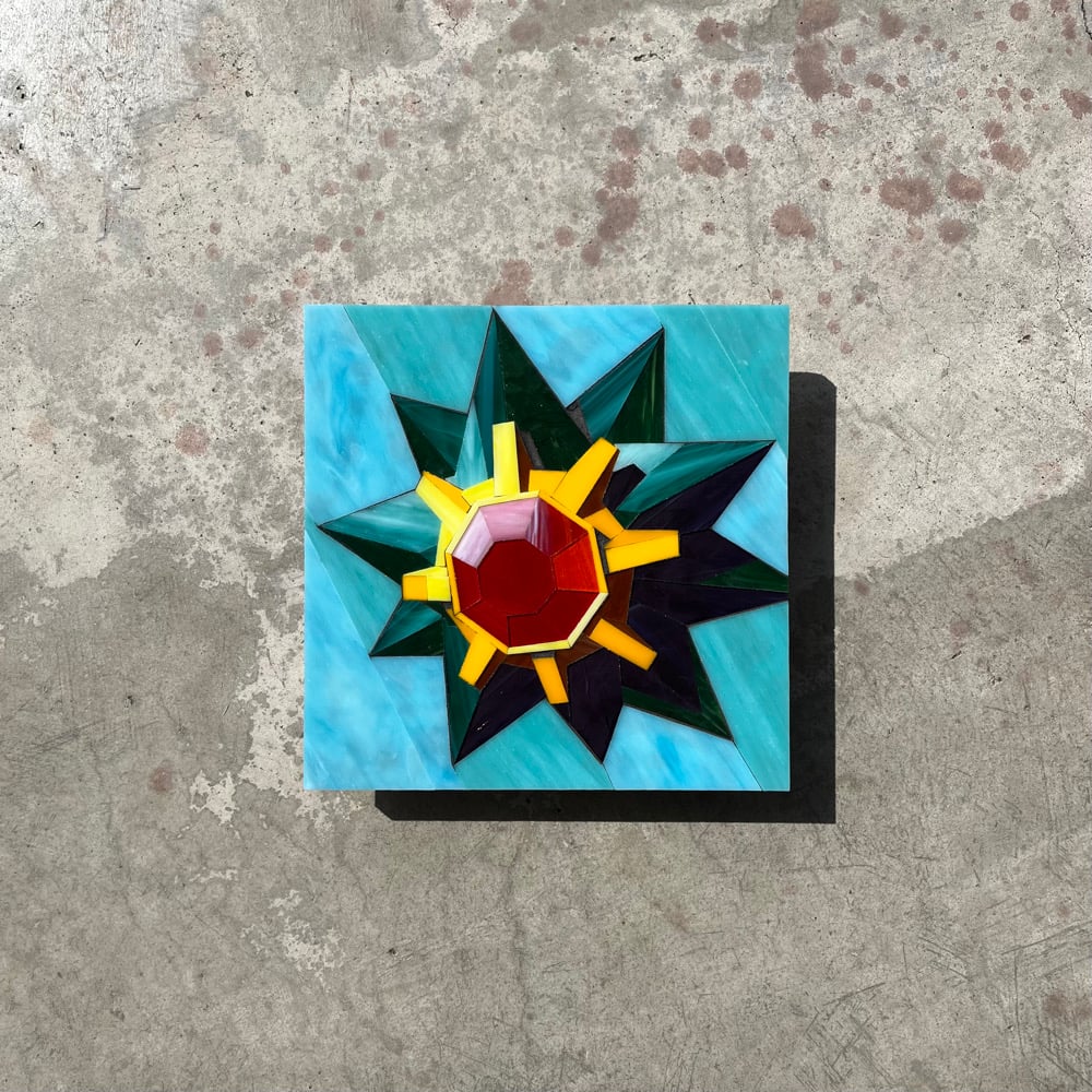 I used this piece as a light study, trying to focus on the values instead of color (thats why not purple lol) I was blessed with just the right collection of glass that came together to make this work :)) — a red cut with white streaks on it: unpainted & literally like a square inch or two, AND a working teal/bluegreen/purple gradient that just absolutely ate